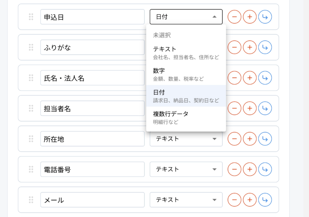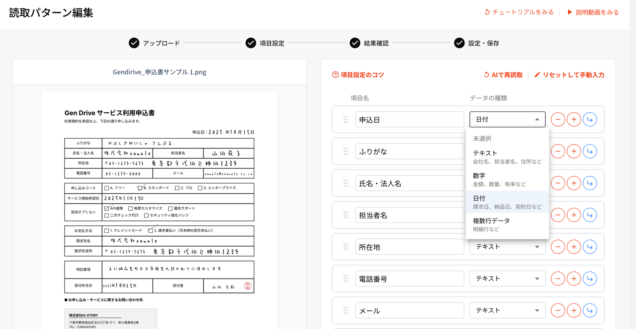 項目設定とは、AIに対して「書類のどこから、どんな情報を抜き出してほしいか」を教えるための「指示書」のようなものです。書類をアップロードすると、AIが書類を読み取り、項目を自動で出力してくれます。最初から全て手動も可能ですが、AIが読み取った項目を、自分で変更する方法がおすすめです。