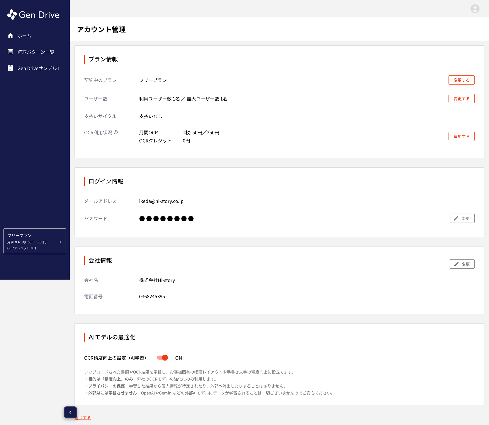 | OCR 精度向上の設定(AI 学習) | ON / OFF のトグルスイッチ |