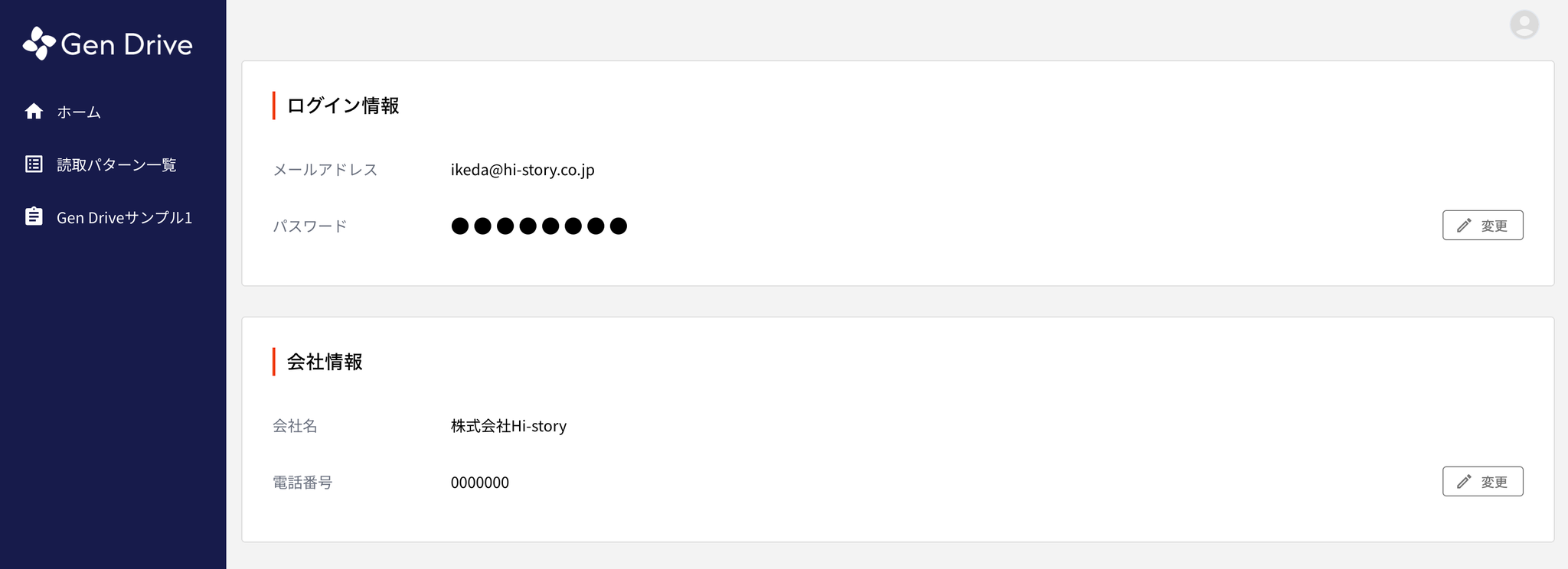 アカウント管理画面の「変更」ボタンからログイン情報・会社情報編集画面に移動が可能です。